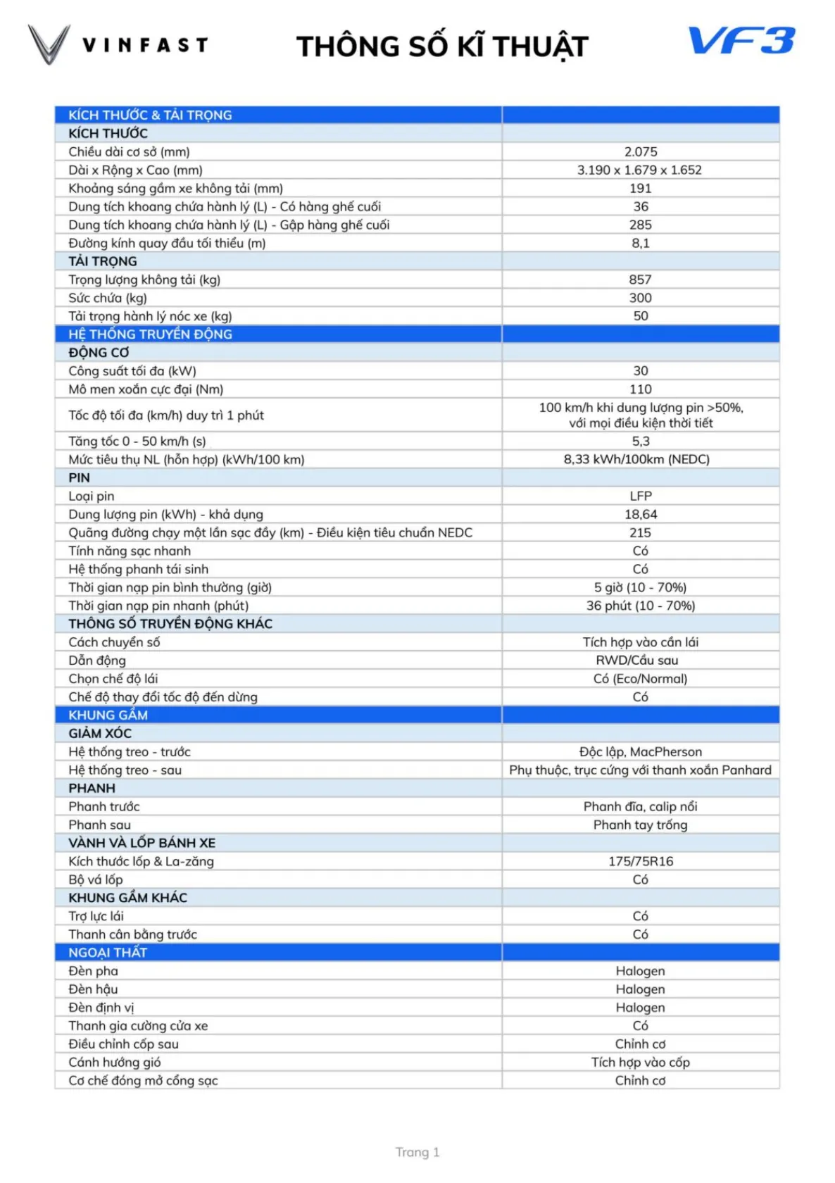 Pin lithium-ion với dung lượng khả dụng 18,64 kWh trên VF3 giúp xe có thể di chuyển tối đa 210 km sau mỗi lần sạc đầy. Thời gian làm đầy pin từ 10% lên 70% bằng sạc chậm là 5 giờ và sạc nhanh là 36 phút.